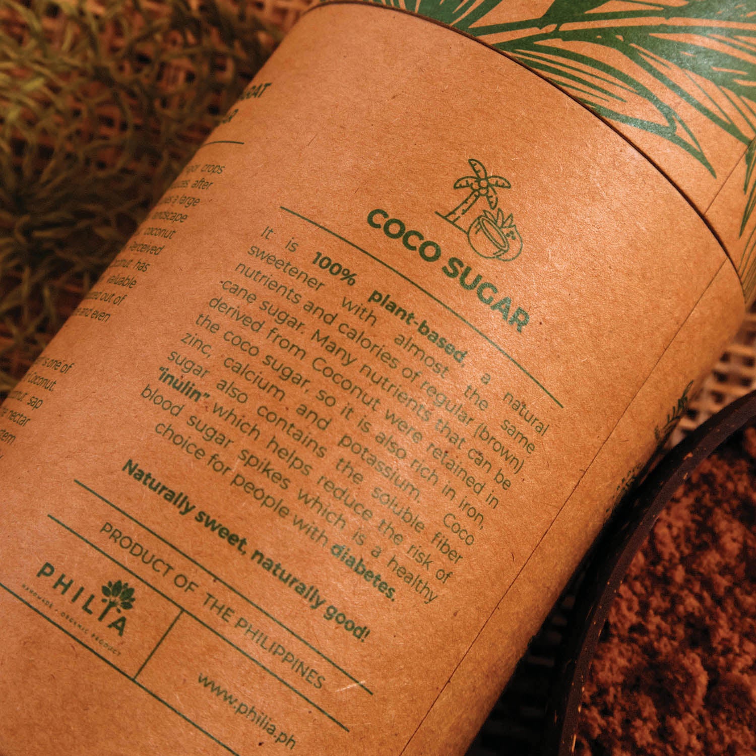It is 100% plant-based, a natural sweetener with almost the same nutrients and calories of regular (brown) cane sugar. Many nutrients that can be derived from Coconut were retained in the coco sugar, so it is also rich in iron, zinc, calcium and potassium.